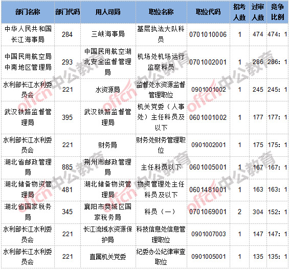截止到10月21日8時(shí),報(bào)名通過審核人數(shù)和競(jìng)爭(zhēng)比例的職位為三峽海事局基層執(zhí)法大隊(duì)科員一職,招錄1人,過審人數(shù)474人,競(jìng)爭(zhēng)比例為474:1。具體信息如下: