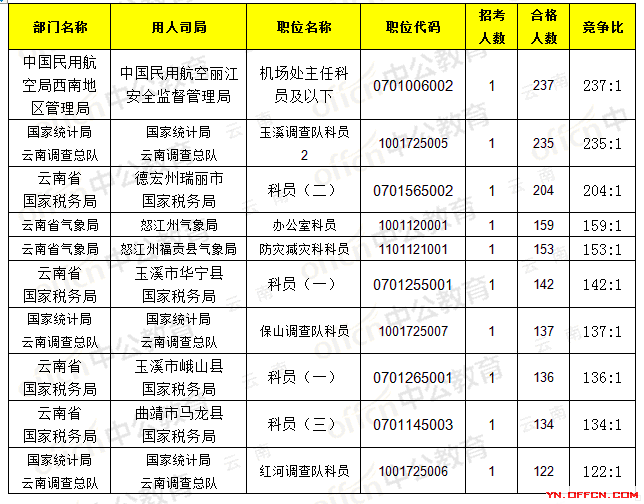 截止21日8時,招錄比例的職位為中國民用航空局西南地區(qū)管理局機場處主任科員及以下,職位代碼是0701006002,招錄1人,通過人數(shù)237人,競爭比237:1