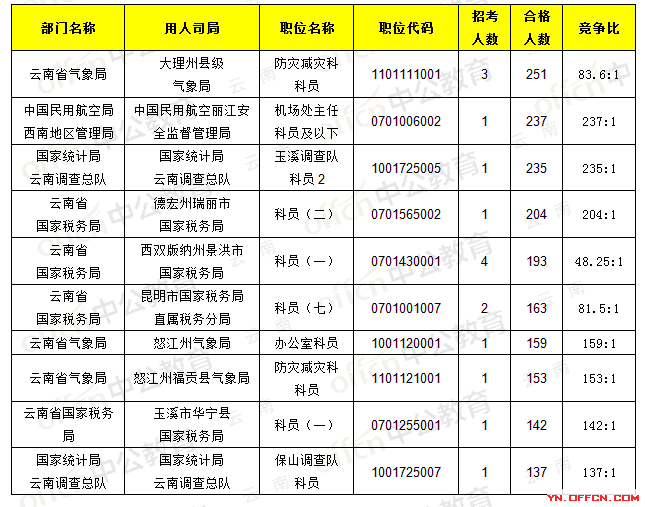報名通過審核人數(shù)前十的職位主要集中在云南省氣象局、中國民用航空局西南地區(qū)管理局、國家統(tǒng)計局云南調查總隊,具體信息如下: