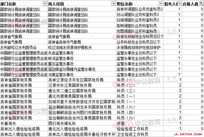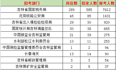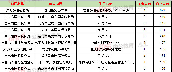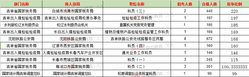 報(bào)名通過審核人數(shù)前十的職位主要集中在吉林省國(guó)稅局和吉林出入境檢驗(yàn)檢疫局,具體信息如下: