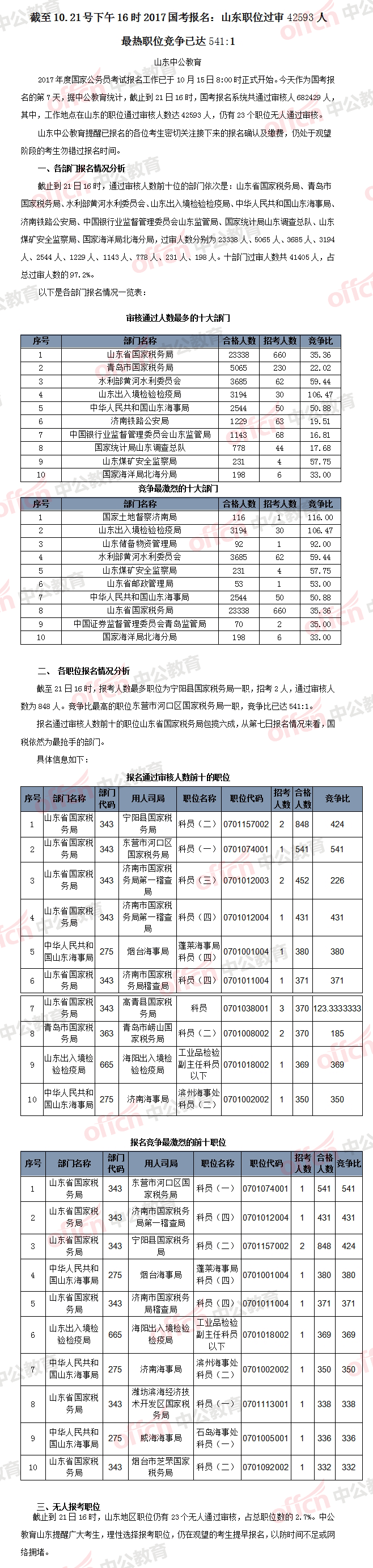 相關(guān)鏈接>>>2017國(guó)家公務(wù)員考試報(bào)名人數(shù)統(tǒng)計(jì)(山東地區(qū))【截至10月21日16時(shí)】