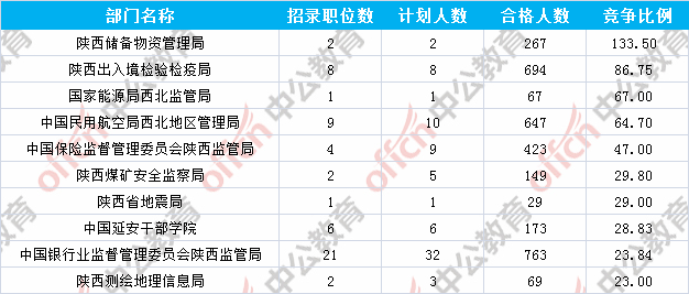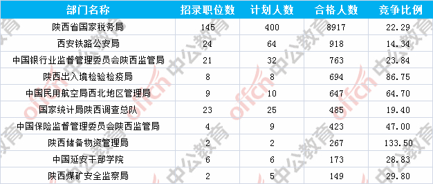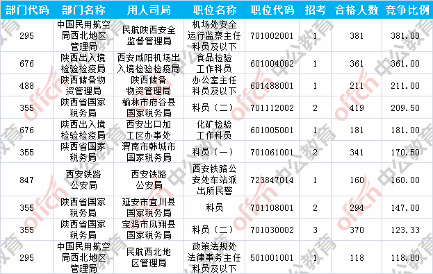 報名通過審核人數(shù)前十的職位主要集中在陜西出入境檢驗(yàn)檢疫局、陜西省國家稅務(wù)局、中國民用航空局西北地區(qū)管理局等部門,具體信息如下: