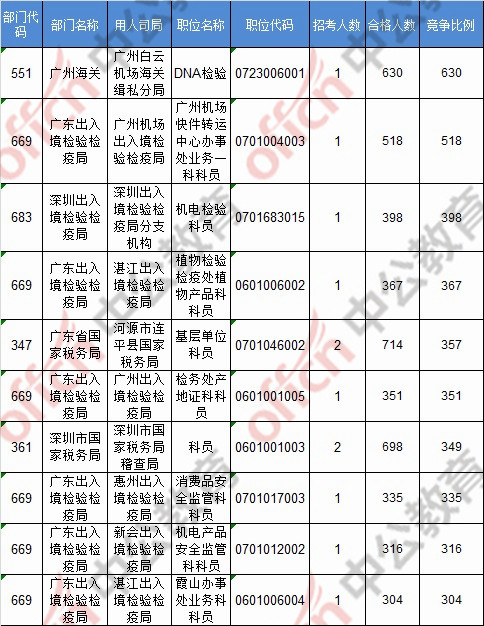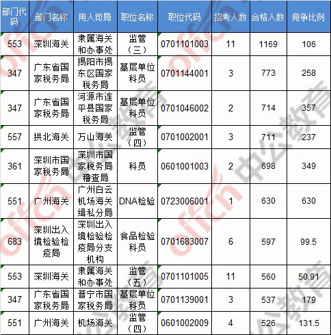 報(bào)名通過(guò)審核人數(shù)前十的職位主要集中在深圳海關(guān)、廣東省國(guó)家稅務(wù)局、拱北海關(guān),具體信息如下: