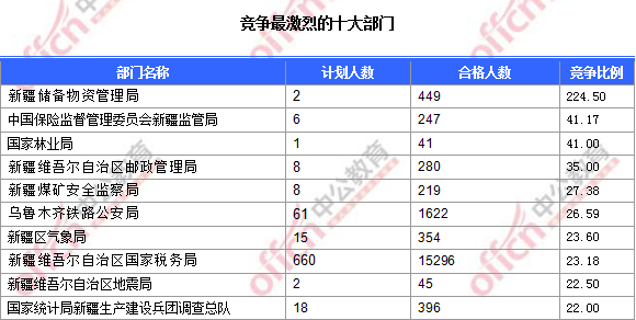 為幫助廣大考生更清晰的了解今日?qǐng)?bào)名情況,新疆中公網(wǎng)校整理了審核通過(guò)人數(shù)前十位的部門(mén)以及競(jìng)爭(zhēng)比例最激烈的十大部門(mén),供廣大考生參考: