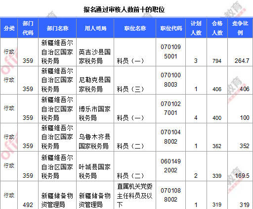 報(bào)名通過(guò)審核人數(shù)前十的職位主要集中在新疆維吾爾自治區(qū)國(guó)家稅務(wù)局、新疆儲(chǔ)備物資管理局、烏魯木齊鐵路公安局部門(mén),具體信息如下: