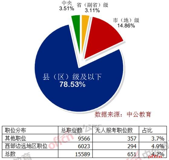 國考那邊熱鬧,這邊卻冷清。與熱門職位形成強烈對比的是,目前仍有2510個職位尚未達到面試比例,其中包含651個無人問津的職位。據(jù)中公網(wǎng)校分析,在這2510個職位中,78%的職位來自縣(區(qū))級及以下,僅有不到7%的職位來自中央和省級,可見考生還是比較偏愛中央和省級職位的。另外,在651個無人報考的職位中,有294個屬于西部邊遠地區(qū)職位,占西部邊遠地區(qū)總招錄職位數(shù)的4.9%,超出其他普通職位的1.2%。