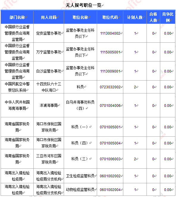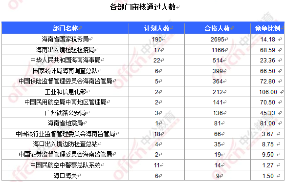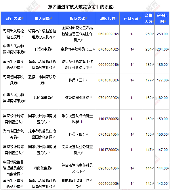 報(bào)名通過(guò)審核人數(shù)前十的職位主要集中在海南出入境檢驗(yàn)檢疫局、海南省國(guó)家稅務(wù)局、中華人民共和國(guó)海南海事局等部門(mén),具體信息如下:
