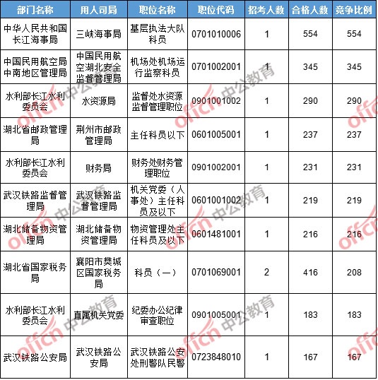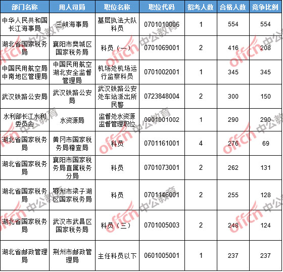 截止到22日8時,競爭比例和報考人數(shù)最多的職位均為中華人民共和國長江海事局三峽海事局基層執(zhí)法大隊科員職位,招錄1人,截止到22日8時通過人數(shù)為554人!