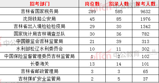 截止到22日16時,競爭比例的職位為吉林鐵路公安處線路警務(wù)區(qū)民警一職,招錄4人,截止到22日16時通過人數(shù)為859人。其次為吉林省國稅局部門。