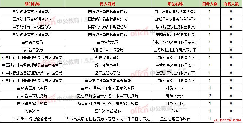 報名通過審核人數(shù)前十的職位主要集中在吉林省國稅局和吉林出入境檢驗檢疫局,具體信息如下: