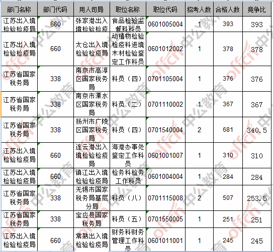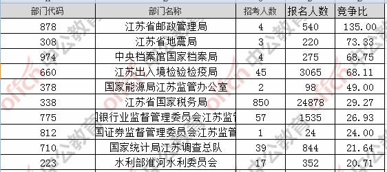 報(bào)名通過審核人數(shù)前十的職位主要集中在江蘇省國家稅務(wù)局、江蘇出入境檢驗(yàn)檢疫局,具體信息如下: