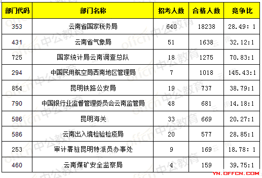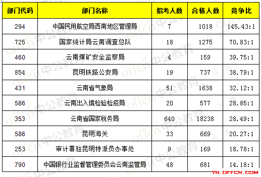 報名通過審核人數(shù)前十的職位主要集中在中國民用航空局西南地區(qū)管理局、云南省國家稅務(wù)局、國家統(tǒng)計局云南調(diào)查總隊等部門,具體信息如下: