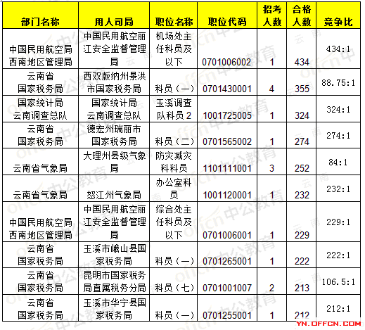 截止22日16時,競爭最激烈的職位為中國民用航空麗江安全監(jiān)督管理局(機場處主任科員及以下),職位代碼0701006002,招錄1人,通過人數(shù)為434人,434:1。