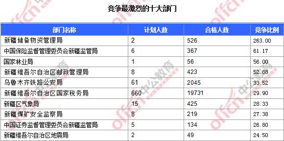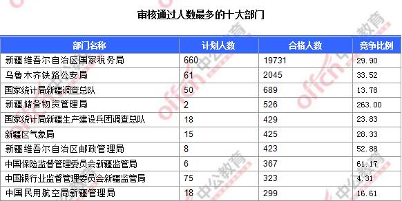 為幫助廣大考生更清晰的了解今日?qǐng)?bào)名情況,新疆中公教育整理了審核通過人數(shù)前十位的部門以及競(jìng)爭(zhēng)比例最激烈的十大部門,供廣大考生參考: