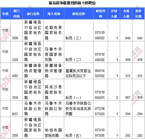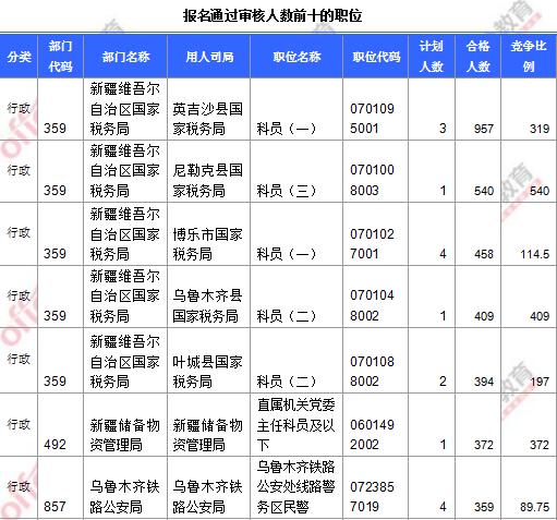 報(bào)名通過審核人數(shù)前十的職位主要集中在新疆維吾爾自治區(qū)國(guó)家稅務(wù)局、新疆儲(chǔ)備物資管理局、烏魯木齊鐵路公安局部門,具體信息如下: