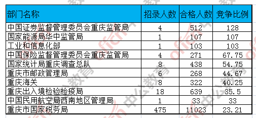 為幫助廣大考生更清晰的了解今日?qǐng)?bào)名情況,重慶中公教育整理了審核通過(guò)人數(shù)前十位的部門以及競(jìng)爭(zhēng)比例最激烈的十大部門,供廣大考生參考: