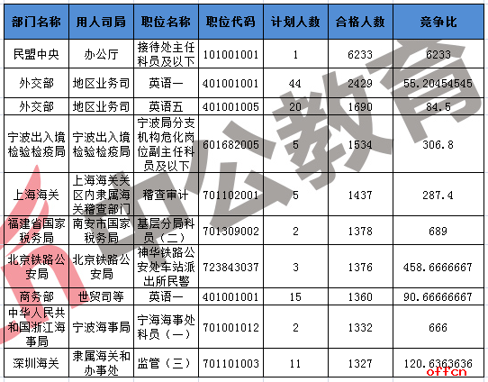 今日最熱職位仍然來(lái)自民盟中央辦公廳接待處主任科員及以下(職位代碼為101001001),該職位招錄1人,目前過(guò)審人數(shù)為6233人,競(jìng)爭(zhēng)比高達(dá)6233:1,這也創(chuàng)下了自2013年度國(guó)考以來(lái),同期競(jìng)爭(zhēng)比例之最。從下表可以看到,自2010年至今,除了2013年以外,奪冠的職位一直來(lái)自中央部委職位。與以往不同的是,今年奪冠職位雖然招錄要求相對(duì)寬松但是要求2年基層工作經(jīng)歷,而這一要求會(huì)把應(yīng)屆生這一報(bào)考主體“拒之門(mén)外”,說(shuō)明了在職人員對(duì)于進(jìn)入中央部委工作的熱情,但中公教育專家還是要提醒此類考生,目前該職位報(bào)名人數(shù)過(guò)多,可以適當(dāng)考慮其他合適職位進(jìn)行填報(bào),這一比例考入的機(jī)會(huì)已經(jīng)比較渺茫。