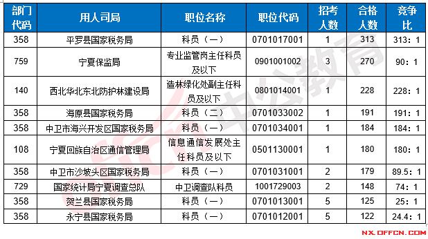 合格人數(shù)前十的職位主要集中在寧夏回族自治區(qū)國(guó)家稅務(wù)局、中國(guó)保險(xiǎn)監(jiān)督管理委員會(huì)寧夏監(jiān)管局、國(guó)家林業(yè)局等部門,具體信息如下: