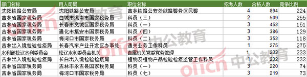 截止到23日8時,競爭比例的職位為吉林鐵路公安處線路警務(wù)區(qū)民警一職,招錄4人,截止到23日8時通過人數(shù)為894人。其次為吉林省國稅局部門。