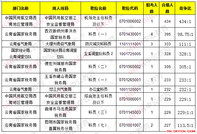 報名通過審核人數(shù)前十的職位主要集中在中國民用航空局西南地區(qū)管理局、云南省國家稅務(wù)局、云南省氣象局等,具體信息如下: