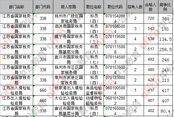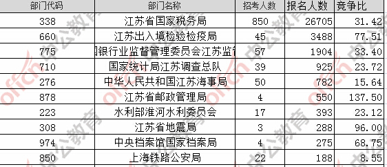 報名通過審核人數前十的職位主要集中在江蘇省國家稅務局、江蘇出入境檢驗檢疫局,具體信息如下: