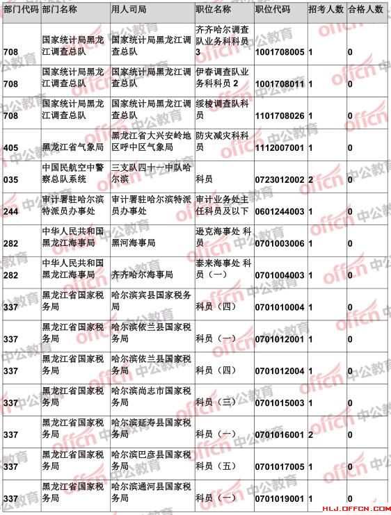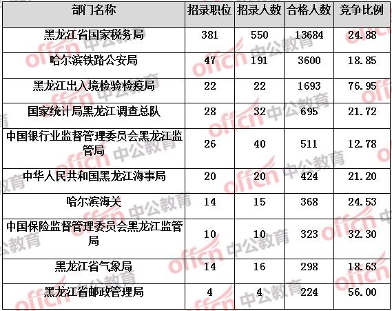 報(bào)名通過(guò)審核人數(shù)前十的職位主要集中在黑龍江省國(guó)家稅務(wù)局、黑龍江出入境檢驗(yàn)檢疫局、哈爾濱鐵路公安局等部門(mén),具體信息如下: