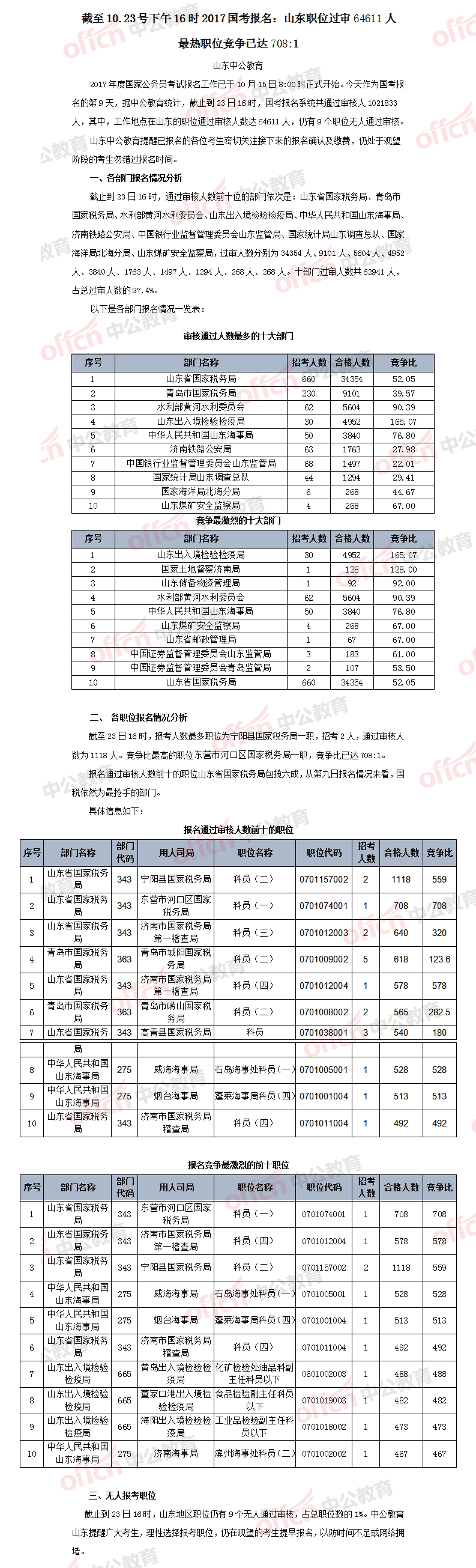【截至23日16時】2017國考報名山東職位過審64611人 最熱職位競爭已達708:1