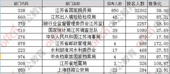 截至24日8時(shí),通過(guò)審核人數(shù)前三位的部門依次是:江蘇省國(guó)家稅務(wù)局、江蘇出入境檢驗(yàn)檢疫局、中國(guó)銀行業(yè)監(jiān)督管理委員會(huì)江蘇監(jiān)管局,三部門通過(guò)審核總?cè)藬?shù)達(dá)38488人,占通過(guò)審核總?cè)藬?shù)的88.5%。