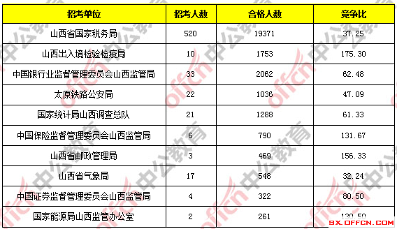 為幫助廣大考生更清晰的了解今日?qǐng)?bào)名情況,山西中公網(wǎng)校整理了合格人數(shù)前十位的部門以及競(jìng)爭(zhēng)比例最激烈的十大部門,供廣大考生參考: