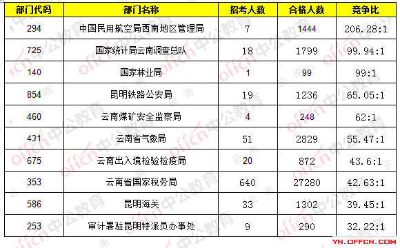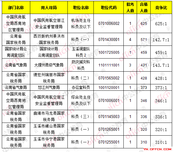 報名通過審核人數(shù)前十的職位主要集中在中國民用航空局西南地區(qū)管理局、云南省國家稅務局、國家統(tǒng)計局云南調(diào)查總隊等部門,具體信息如下:
