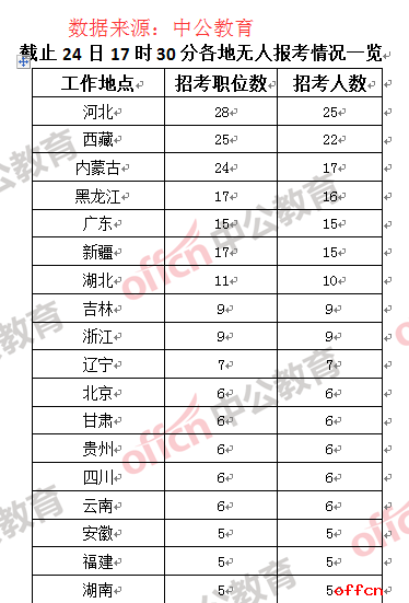通過中公網(wǎng)校統(tǒng)計數(shù)據(jù)可以看到,工作地點在河北省的職位無人通過審核數(shù)量最多,為28個職位,次之是西藏和內(nèi)蒙古,而考生報考江蘇和重慶兩地的“熱情”相對“高漲”,只有1個職位無人報考。