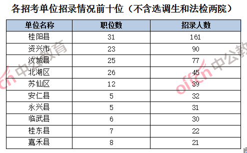 從招錄單位人數(shù)前十來(lái)看,桂陽(yáng)縣招錄人數(shù)最多,占招錄總?cè)藬?shù)的29.38%;其次為資興市,招錄人數(shù)占16.42%。