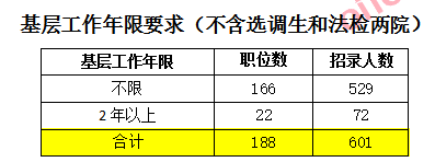 湖南省對(duì)基層工作經(jīng)歷要求寬泛,本次招錄共有88.02%職位對(duì)基層工作經(jīng)歷無(wú)限制,招錄人數(shù)高達(dá)88.30%,應(yīng)屆生機(jī)會(huì)多多。要求2年以上基層工作經(jīng)歷的招錄人數(shù)占11.70%。