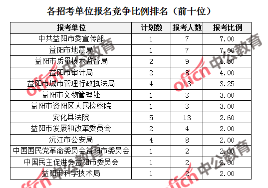 競爭熱門招考單位,前三位依次是:中共益陽市委宣傳部(競爭比例7:1)和益陽市地震局(競爭比例7 :1)、益陽市質(zhì)量技術監(jiān)督局(競爭比例4.5:1)、益陽市審計局(競爭比例4:1)。