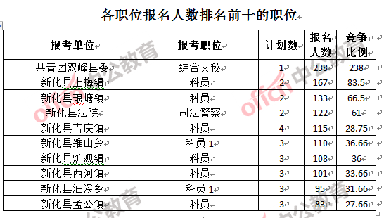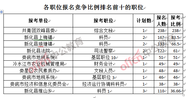競爭熱門職位,前三位依次是:共青團(tuán)雙峰縣委綜合文秘(競爭比例238:1)、新化縣上梅鎮(zhèn)科員(競爭比例83.5:1)和新化縣瑯塘鎮(zhèn)科員(競爭比例66.5:1)。