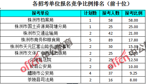 競爭熱門招考單位,前三位依次是:株洲市檔案局(競爭比例58:1)、株洲市國土資源局荷塘分局(競爭比例25:1)和株洲市交通運(yùn)輸局(競爭比例21:1)。