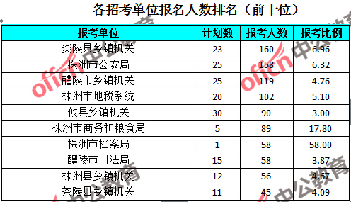 為幫助廣大考生更清晰的了解報(bào)名情況,中公教育整理了湖南株洲各招考單位的報(bào)名人數(shù)排名以及競爭比例排名,供廣大考生參考:
