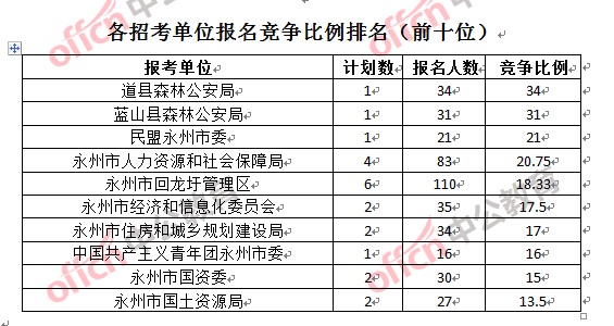 競(jìng)爭(zhēng)熱門(mén)招考單位,前三位依次是:道縣森林公安局(競(jìng)爭(zhēng)比例34:1)、藍(lán)山縣森林公安局(競(jìng)爭(zhēng)比例31:1)和民盟永州市委(競(jìng)爭(zhēng)比例21:1)。