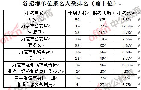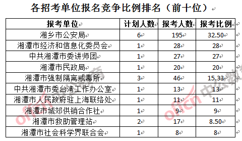 單位,前三位依次是:湘鄉(xiāng)市公安局(競爭比例32.5:1)、湘潭市經(jīng)濟和信息化委員會(競爭比例28:1)和湘中共湘潭市委團(競爭比例27:1)。