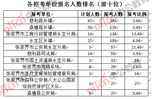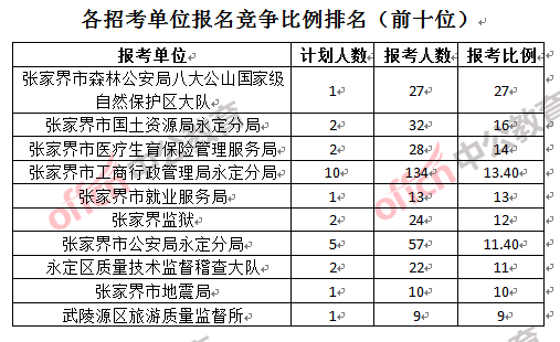 競爭熱門招考單位,前三位依次是:張家界市森林公安局八大公山自然保護區(qū)大隊(競爭比例27:1)、張家界市國土資源局永定分局(競爭比例16:1)和張家界市醫(yī)療生育保險管理服務局(競爭比例14:1)。