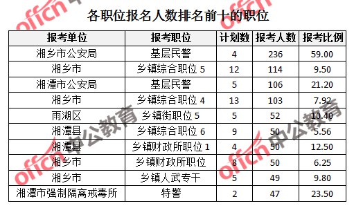 為幫助廣大考生更清晰的了解報(bào)名情況,中公教育整理了湘潭市各職位的報(bào)名人數(shù)排名以及競(jìng)爭(zhēng)比例排名,供廣大考生參考: