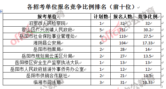 競爭熱門招考單位,前三位依次是:汨羅市人民檢察院(競爭比例32:1)、君山區(qū)廣興洲鎮(zhèn)人民政府(競爭比例30.2:1)和岳陽市社會保險事業(yè)管理處(競爭比例27.5:1)。