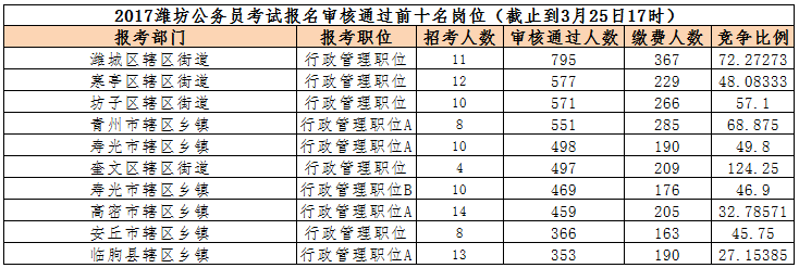 報(bào)名期間最后一次的2017年濰坊公務(wù)員報(bào)名人數(shù)統(tǒng)計(jì)終于發(fā)布。據(jù)統(tǒng)計(jì)截止到25日17:00已經(jīng)報(bào)名總?cè)藬?shù)未公布,審核通過總?cè)藬?shù)為:16770人,已經(jīng)繳費(fèi)總?cè)藬?shù)為:7131人。截止目前濰城區(qū)轄區(qū)街辦行政管理職位審核通過人數(shù)392人,繳費(fèi)人數(shù)139人,成為審核人數(shù)最多,已交費(fèi)人數(shù)最多的崗位。中共濰坊市委農(nóng)工辦行政管理職位過審人數(shù)和招考人數(shù)比為230:1。另外截止到今天17:00濰坊市還有6個(gè)崗位無人通過審核,26崗位無人繳費(fèi)。木木在這里提醒大家:2017濰坊公務(wù)員考試報(bào)名已經(jīng)進(jìn)行到第3日,還剩一天的報(bào)名時(shí)間,希望還在觀望的考生該出手時(shí)就出手,按照往年報(bào)名情況預(yù)計(jì),明天很容易出現(xiàn)報(bào)名系統(tǒng)不穩(wěn)定以及審核不通過等原因?qū)е聢?bào)名不的情況,請考生注意。另外還有部分崗位還未審核的考生及時(shí)關(guān)注審核信息就是修改審核信息;已經(jīng)審核通過的考生記得繳費(fèi)截止時(shí)間為3月26日16:00。祝大家報(bào)考順利。具體數(shù)據(jù)詳見下表: