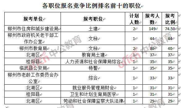 競爭熱門招考單位,前三位依次是:郴州市住房和城鄉(xiāng)建設局(競爭比例53.33:1)、郴州市政府機關老干部工作辦公室(競爭比例44:1)和郴州市教育局(競爭比例40:1)。