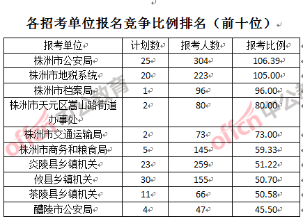 競爭熱門招考單位,前三位依次是:株洲市公安局 (競爭比例106:1)、株洲市地稅系統(tǒng)(競爭比例105:1)和株洲市檔案局(競爭比例96:1)。