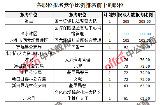 為幫助廣大考生更清晰的了解報(bào)名情況,中公網(wǎng)校整理了永州市各職位的報(bào)名人數(shù)排名以及競(jìng)爭(zhēng)比例排名,供廣大考生參考: