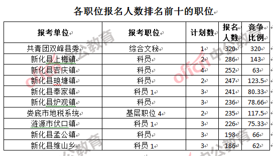 競爭熱門職位,前三位依次是:共青團雙峰縣委綜合文秘(競爭比例320:1)、新化縣坐石鄉(xiāng)科員1(競爭比例177:1)和新化縣石沖口鎮(zhèn)科員(競爭比例150:1)。