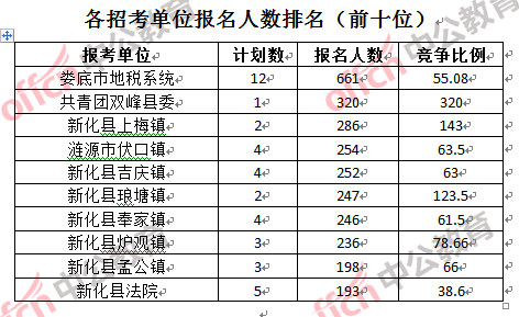 為幫助廣大考生更清晰的了解報(bào)名情況,中公網(wǎng)校整理了婁底市各招考單位的報(bào)名人數(shù)排名以及競爭比例排名,供廣大考生參考: