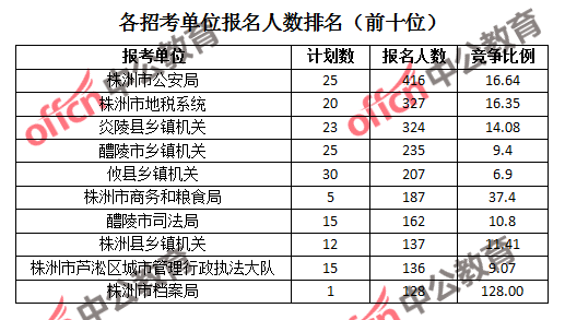 為幫助廣大考生更清晰的了解報名情況,中公網(wǎng)校整理了株洲市各招考單位的報名人數(shù)排名以及競爭比例排名,供廣大考生參考: