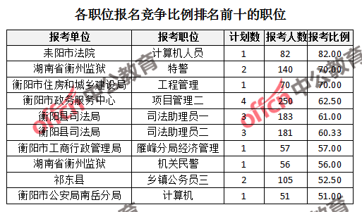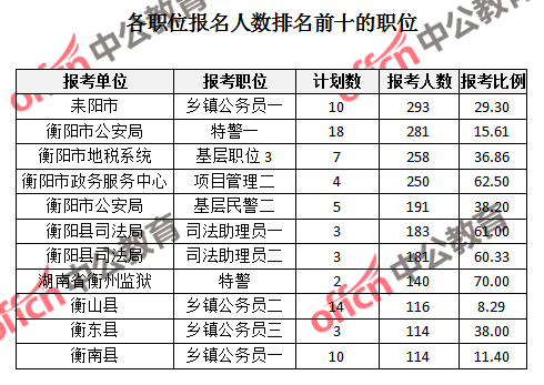為幫助廣大考生更清晰的了解報名情況,中公網(wǎng)校整理了衡陽市各職位的報名人數(shù)排名以及競爭比例排名,供廣大考生參考: